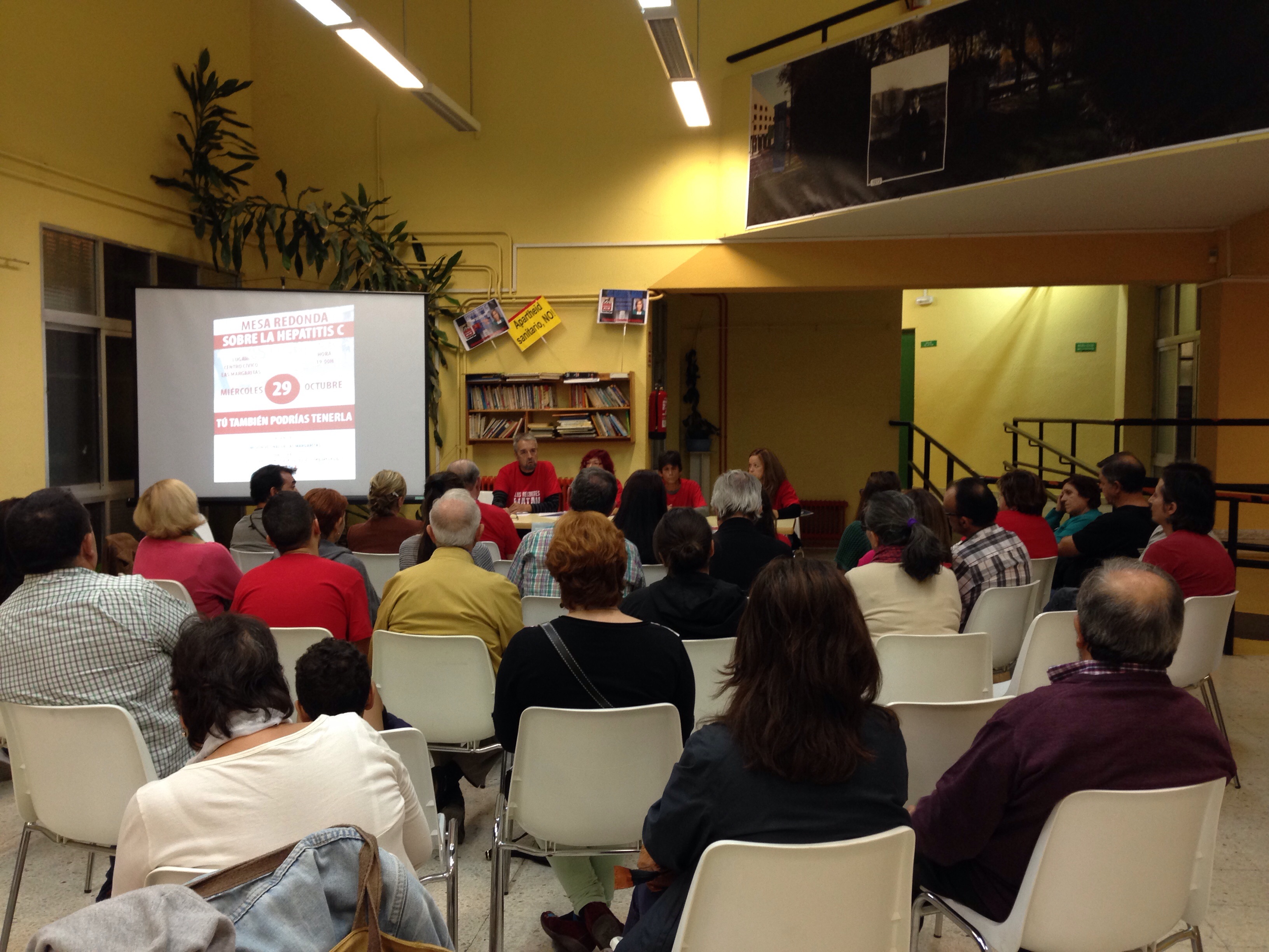 El miércoles pasado estuvimos en la mesa debate sobre los enfermos de Hepatitis C que se celebraba en el Centro Cívico de Las Margaritas, fuimos invitados por una vecina que no dudó en trasladarnos su difícil situación personal: su marido enfermo de Hepatitis C está en una situación muy grave y existiendo un tratamiento que erradica la enfermedad, un medicamento que se llama Sovaldi, no puede acceder a él. El miedo es constante, porque temen que el medicamento llegue demasiado tarde.