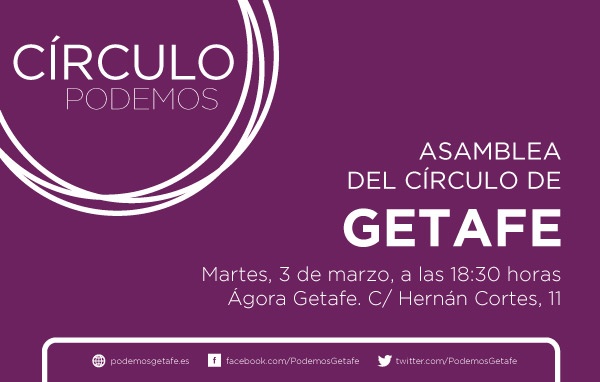 La próxima asamblea del Círculo Podemos de Getafe será el martes 3 de marzo a las 18:30h en la Asociación Ágora Getafe (C/Hernán Cortés, 11).