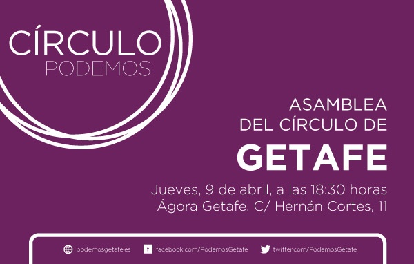 La próxima asamblea del Círculo Podemos de Getafe será el jueves 9 de abril a las 18:30 horas en la Asociación Ágora Getafe (C/Hernán Cortés, 11).