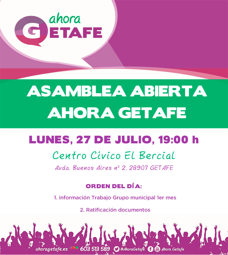 Informamos de la próxima asamblea de Ahora Getafe: Tendrá lugar el lunes 27 de julio a las 19:00 horas en el Centro Cívico de El Bercial (Avda. Buenos Aires, 2)