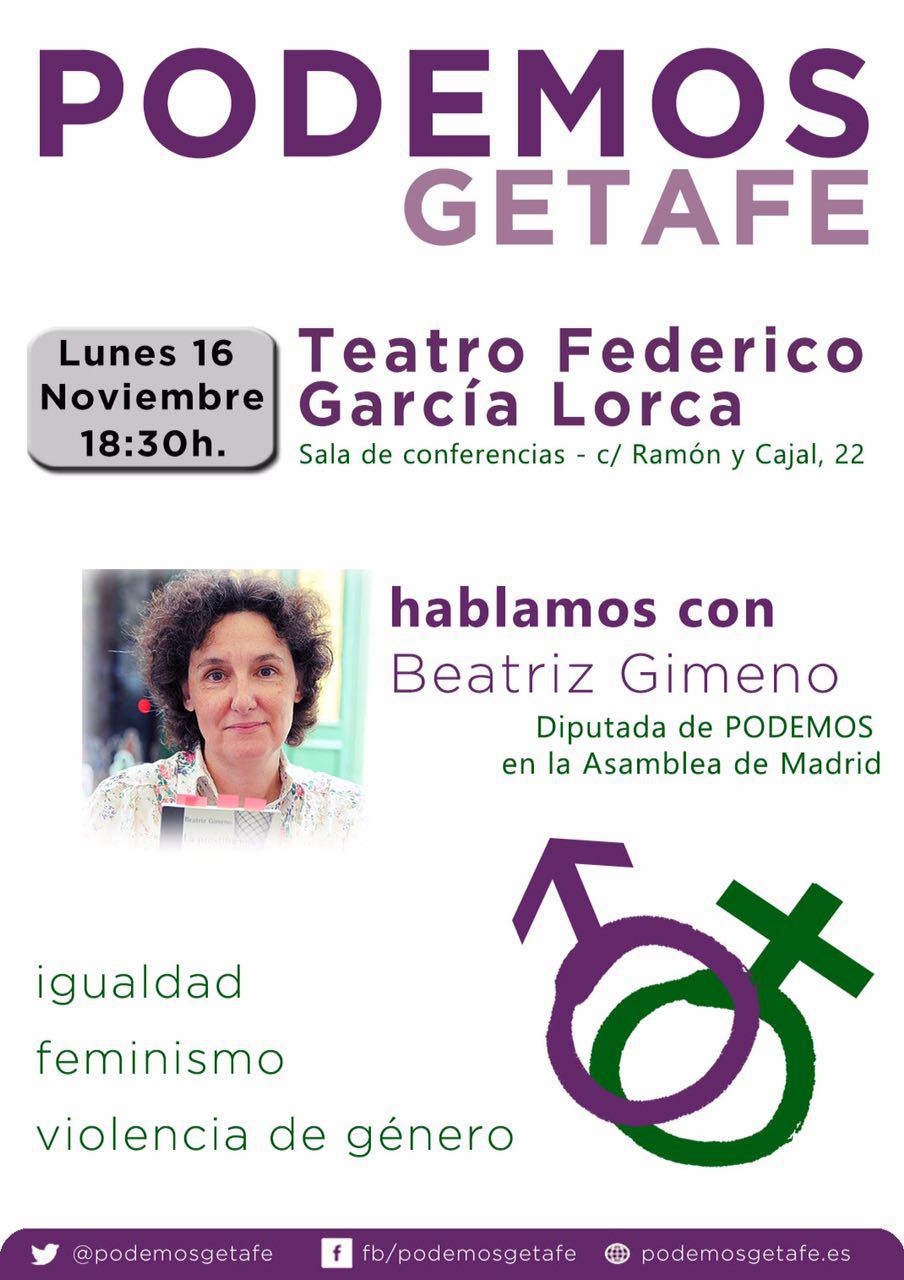 El lunes 16 de noviembre, a las 18:30, hablaremos con Beatriz Gimeno sobre igualdad, femenismo y violencia de género. Beatriz Gimeno es diputada de Podemos en la Asamblea de Madrid