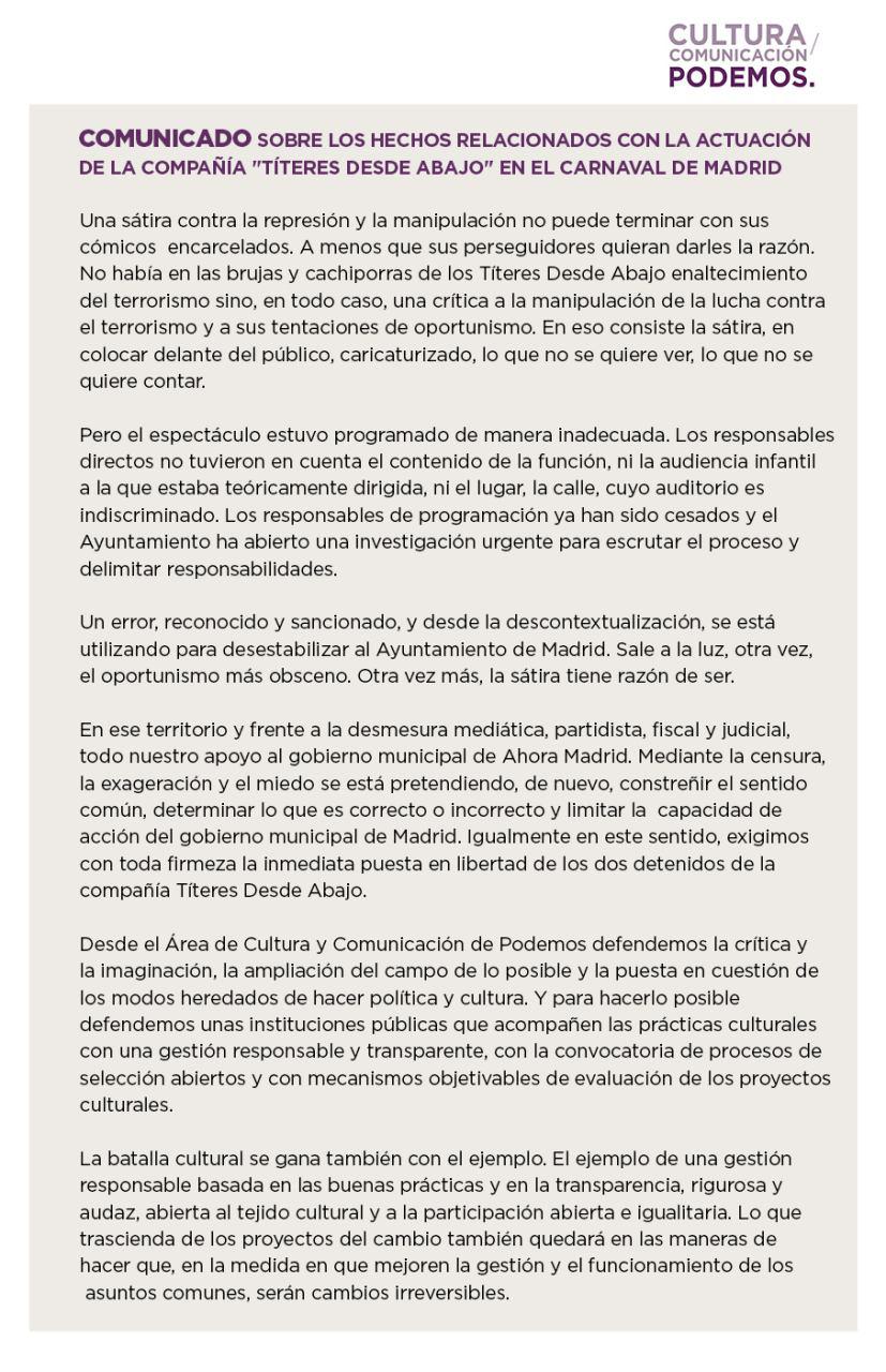 «Desde Podemos Madrid celebramos la noticia de la puesta en libertad de los titiriteros encarcelados el pasado viernes con motivo de la representación de una obra satírica. Sin embargo, insistimos en que, independientemente del contenido de la obra y la opinión que pueda merecer, la libertad de expresión figura en el artículo 19 de la Declaración Universal de Derechos Humanos y debe considerarse por encima de cualquier otra estimación. Es inaceptable en un Estado de Derecho y democrático que dos titiriteros acaben en la cárcel por manejar unos muñecos. La situación daña nuestra imagen como país, la prensa extranjera destaca de nuevo el recorte de libertades en España…»