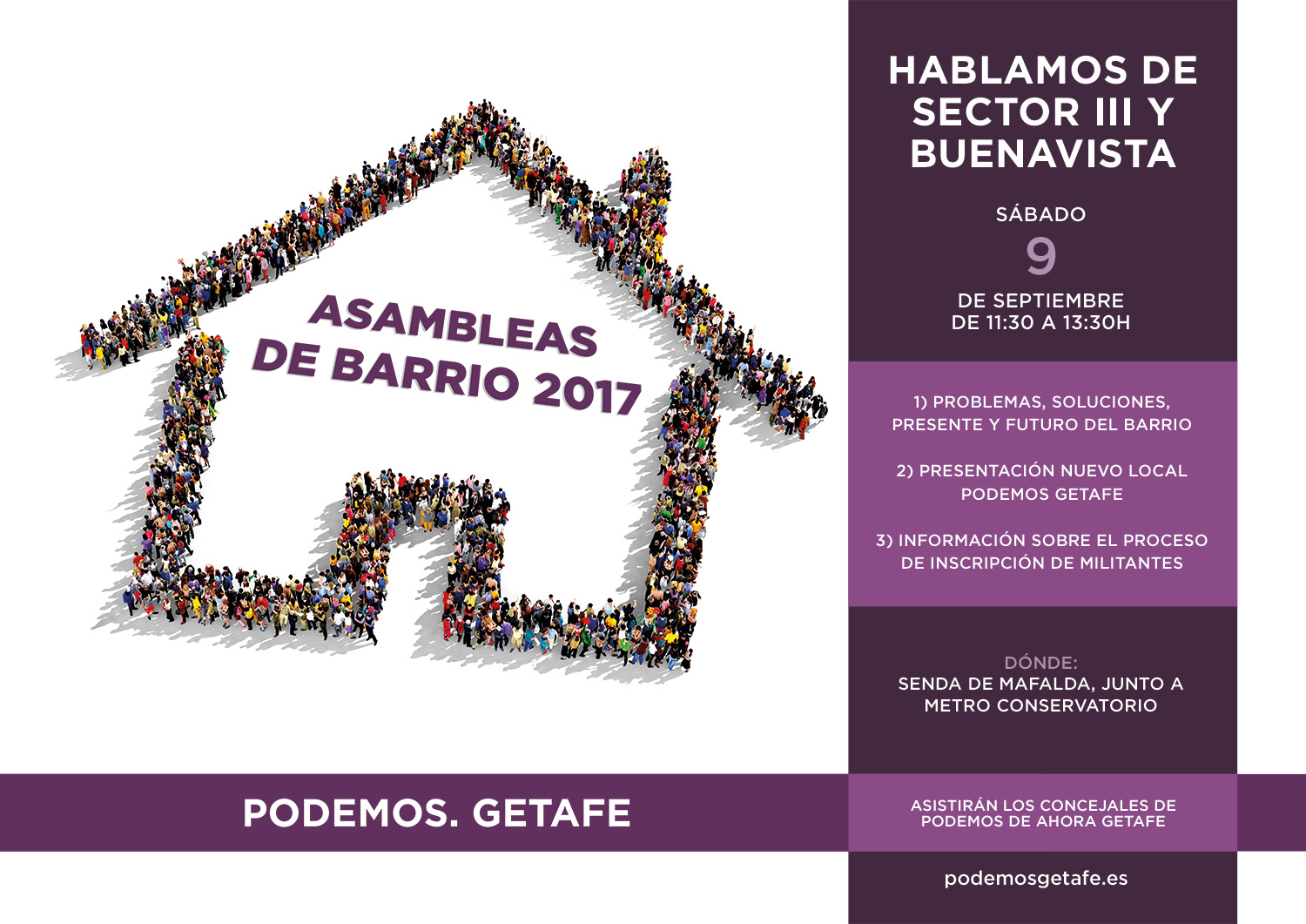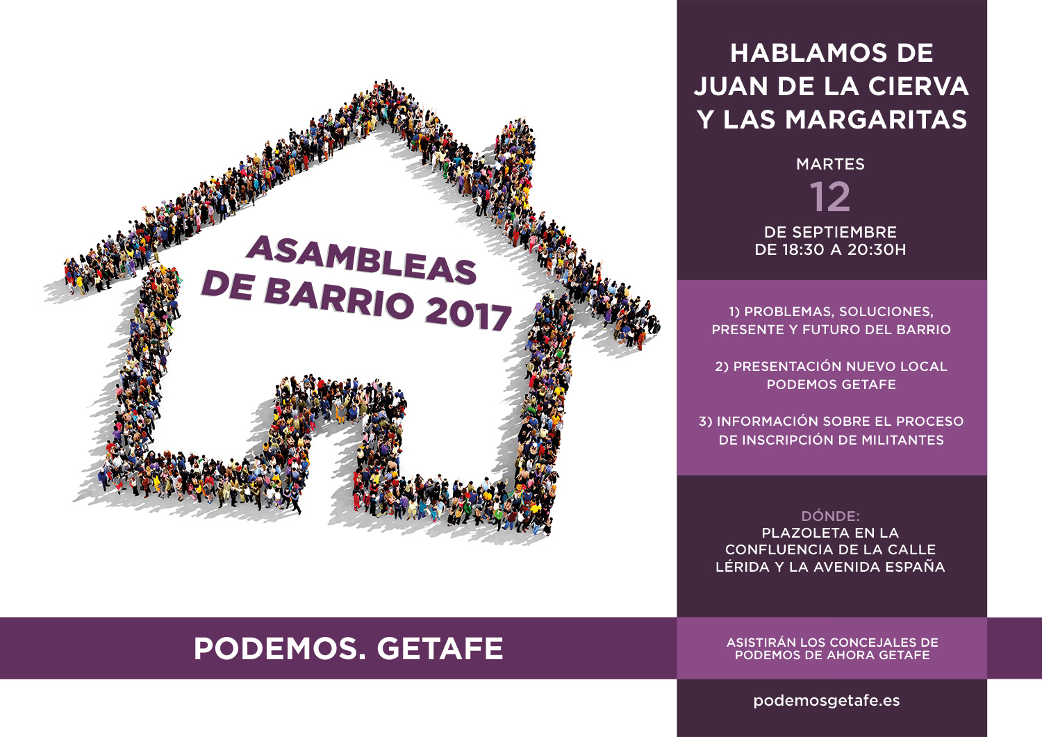 Durante este mes de septiembre celebraremos 6 asambleas de barrio para hablar de Getafe, de sus problemas, soluciones, presente y futuro de nuestra ciudad. También informaremos del futuro local del Círculo Podemos de Getafe y de la inscripción como militante en Podemos. Estas son las fechas y lugares de las asambleas: