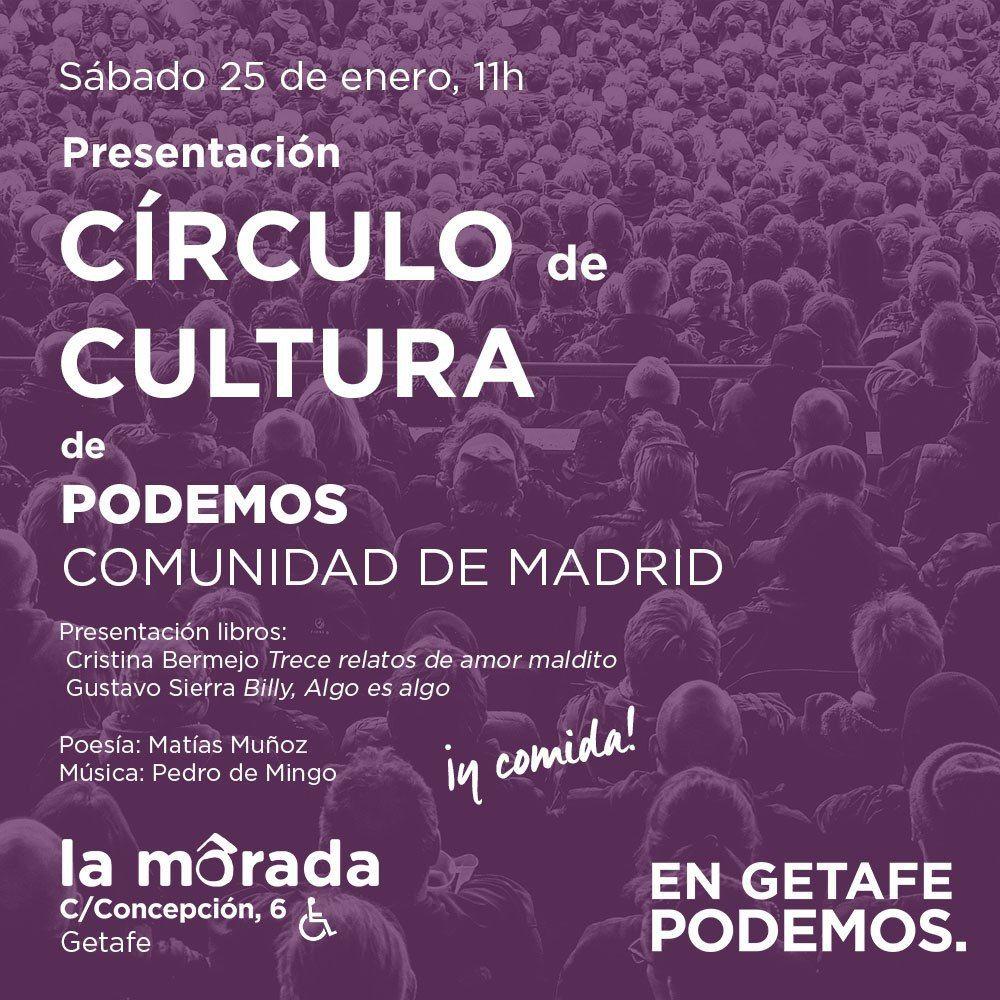 GETAFE/ 20 ENERO 2020/. El próximo sábado 25 de enero a partir de las 11h el círculo de Podemos Getafe organiza una jornada cultural abierta, a modo de presentación en nuestro municipio del círculo de cultura de la Comunidad de Madrid.