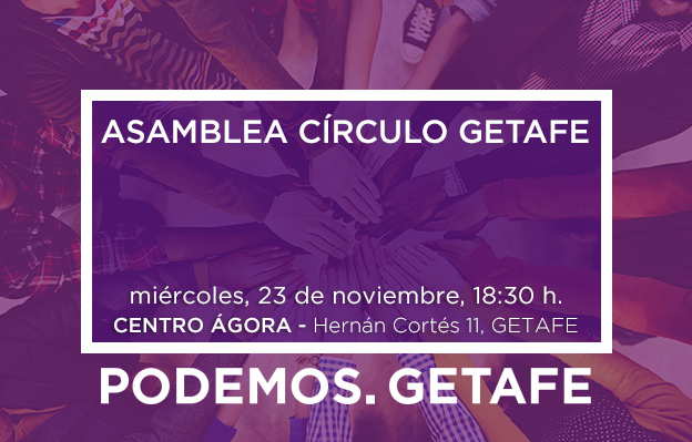 Nueva Asamblea del Círculo Podemos de Getafe El miércoles 23 de noviembre, en el Centro Ágora (C/ Hernán Cortés, 11) A las 18:30 horas Orden del día: – Reestructuración y validación del consejo ciudadano – Información sobre la comisión institucional...